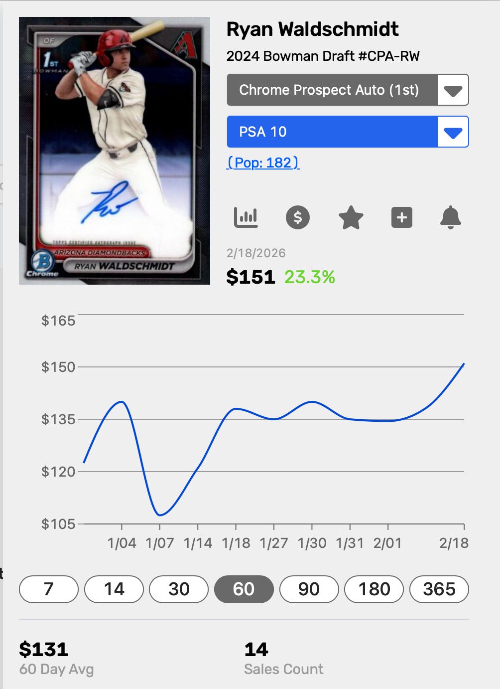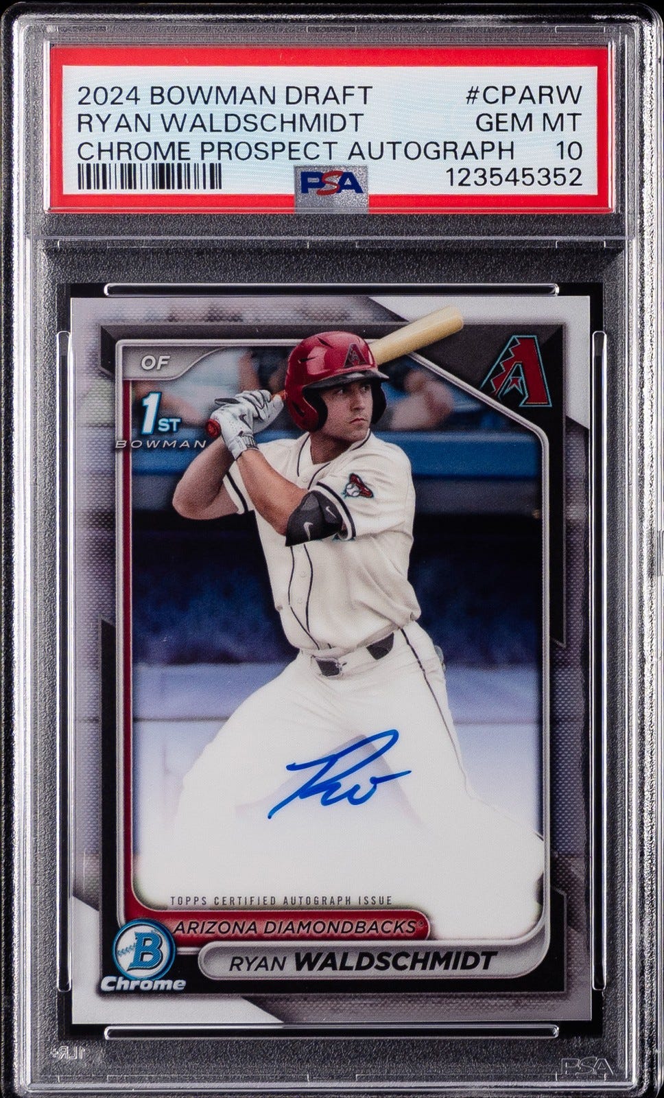 The market for Waldschmidt’s 1st Bowman Base Auto in a PSA 10 has seen a steady climb as his MLB debut nears, currently trading in the $135–$150 range. Waldschmidt’s cards are benefiting from his status as the consensus #1 prospect in the Diamondbacks’ system. Recent sales data indicates a 5–8% uptick in value since the start of Spring Training, driven by his early Cactus League success. For investors, the current market reflects an “Opening Day” tax; however, should he break camp and maintain his projected .340+ OBP, his base autos are positioned to follow the upward trajectory seen by previous D-backs graduates like Corbin Carroll.